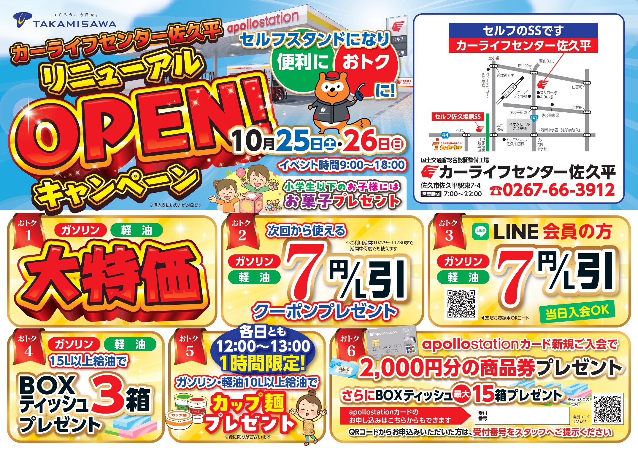 10/2(木)よりセルフ化しプレオープンしたカーライフセンター佐久平ですが、10/25(土)・26日(日)のリニューアルイベントで本格オープンとさせていただきます。ガソリン・軽油大特価をはじめ、BOXティッシュプレゼントやタイムサービス、次回使える割引券プレゼントなど各種特典が盛りだくさん!!中でもアポロステーションカードのご入会でBOXティッシュ最大15箱&有名スーパーの商品券2,000円分をプレゼント!!ぜひこの二日間、皆様のご来店を心よりお待ちしております!!
